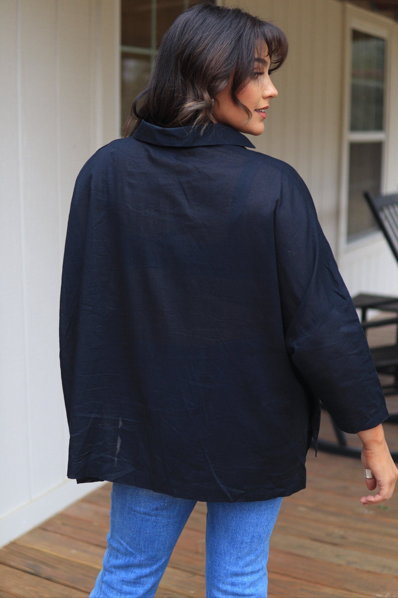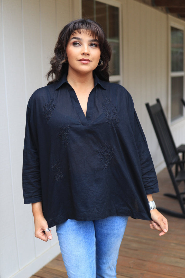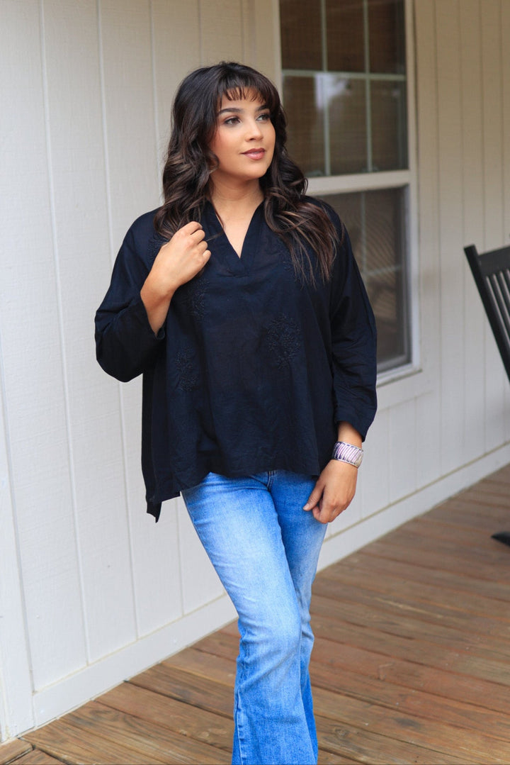 This black blouse features intricate embroidery that adds a refined, artisanal touch to your wardrobe. Crafted with attention to detail, it combines classic elegance with subtle texture, making it a versatile piece suitable for both professional and casual settings. The long sleeves provide a polished silhouette, enhancing comfort and style throughout the day. Ideal for those who appreciate sophisticated craftsmanship in their clothing.