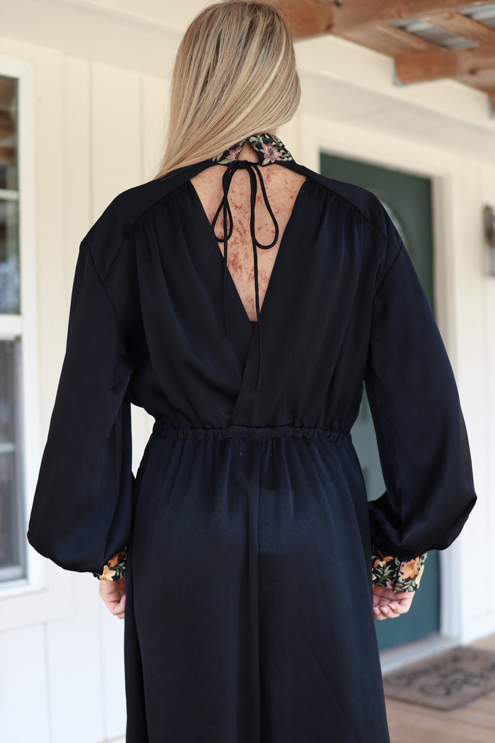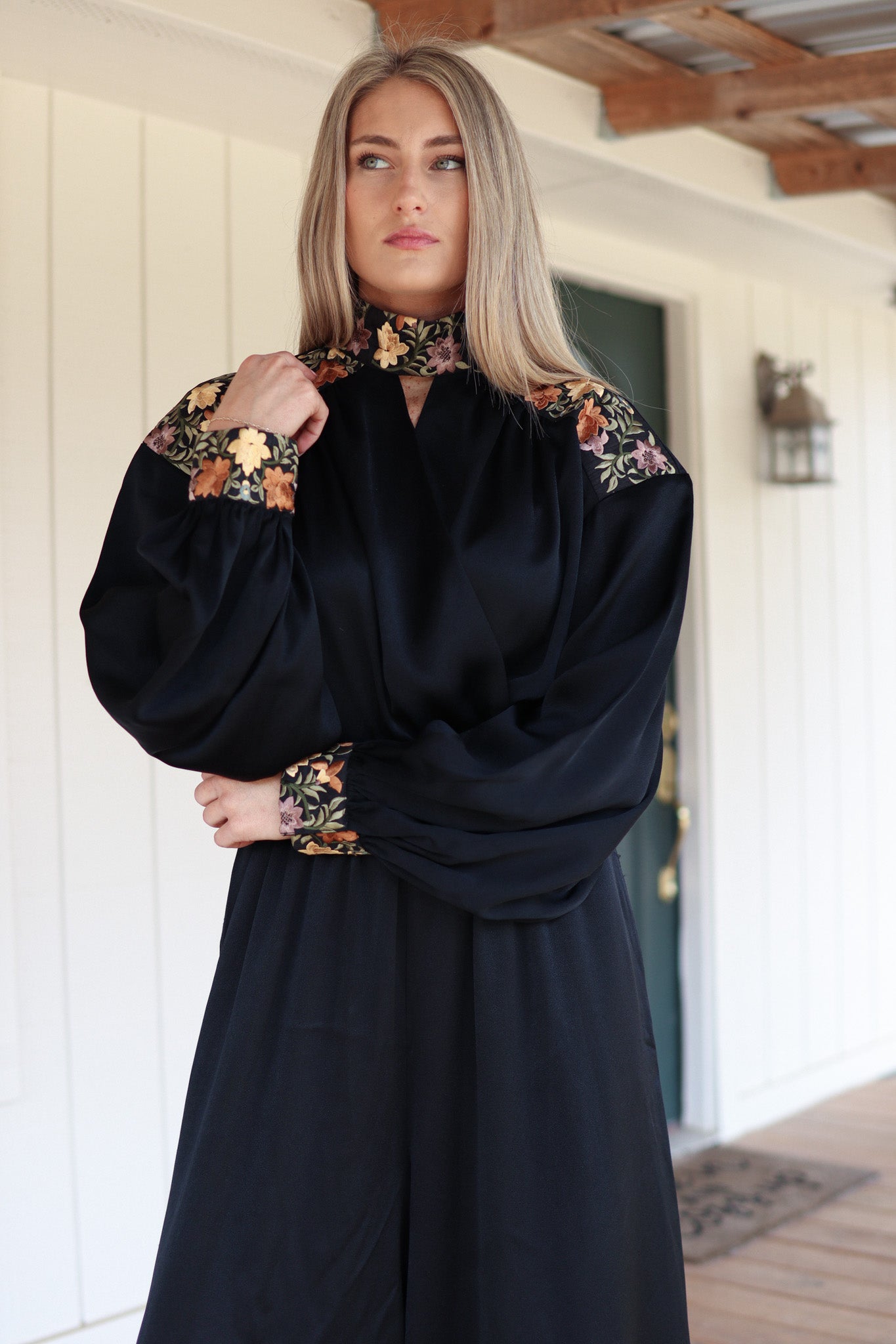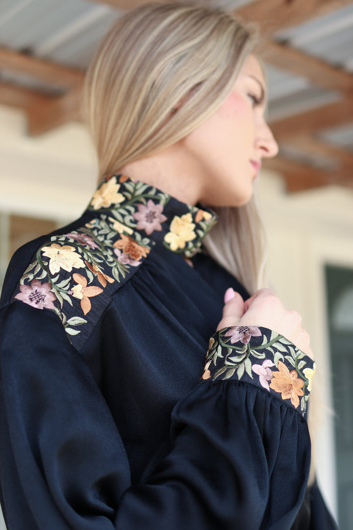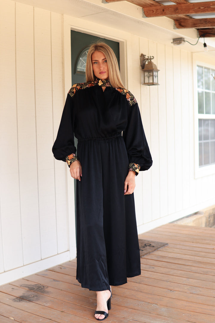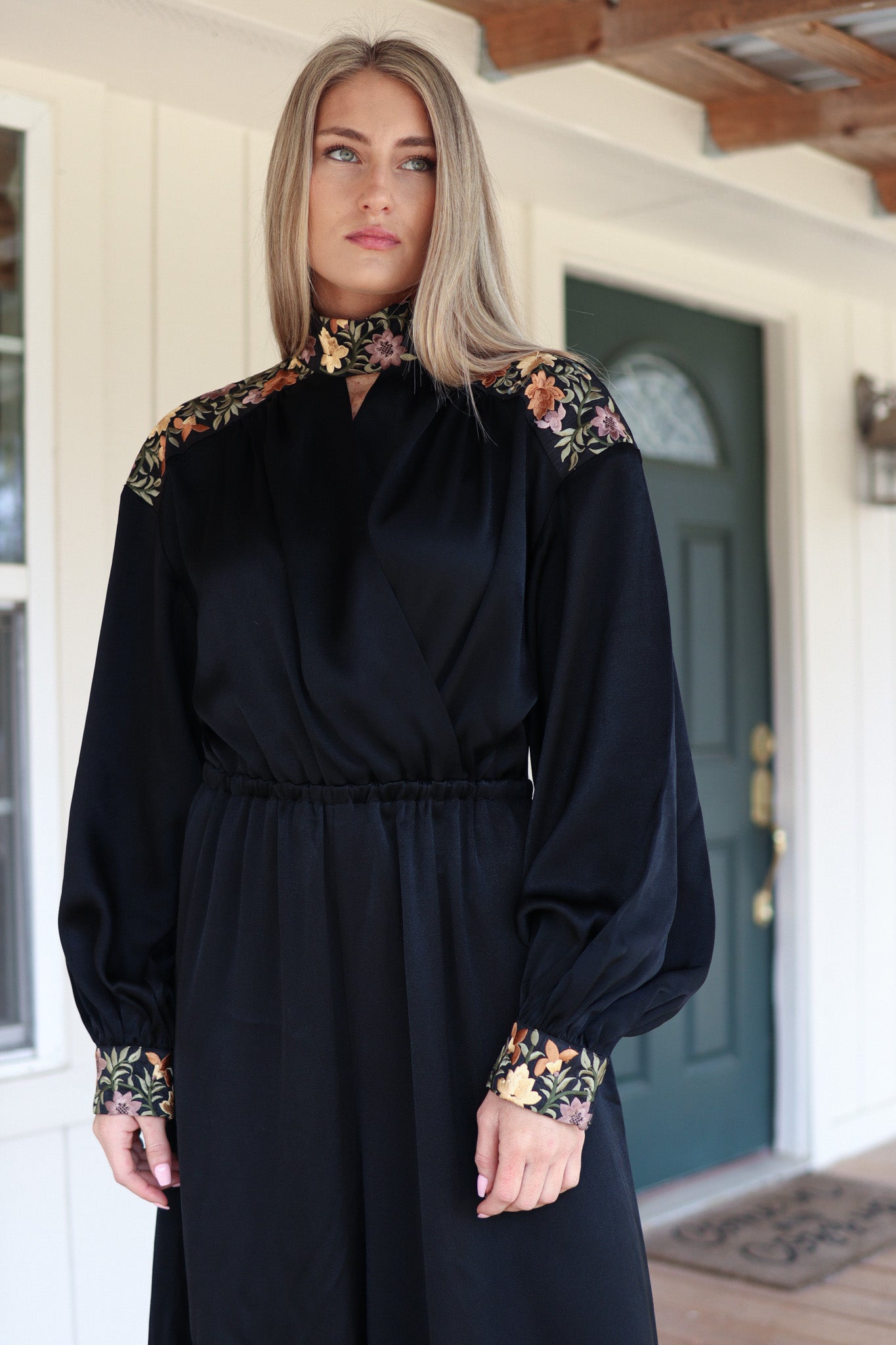 Crafted from the highest quality Japanese rayon, this black jumpsuit offers a super-soft, silky feel that hugs your body and accentuates your curves. The intricate embroidery detail along the cuffs and up to the high mandarin collar adds a touch of elegance and refinement. A true staple piece for your wardrobe, this jumpsuit elevates the Boho style with its sophisticated design. Perfect for both day and night, it’s a versatile, timeless piece that blends comfort with luxury.