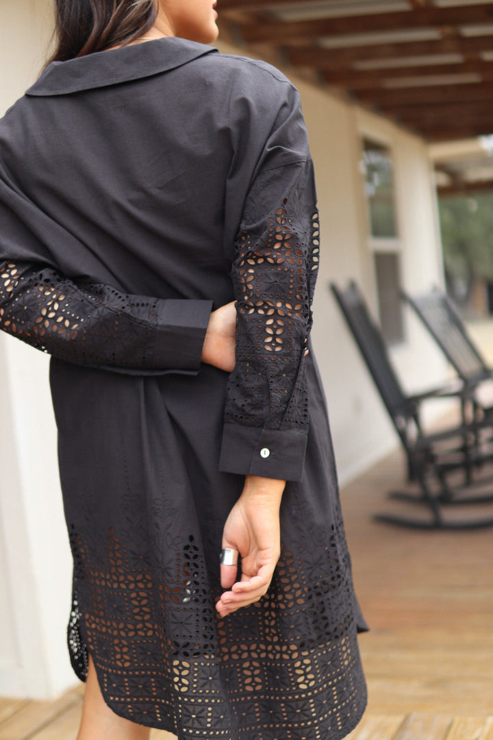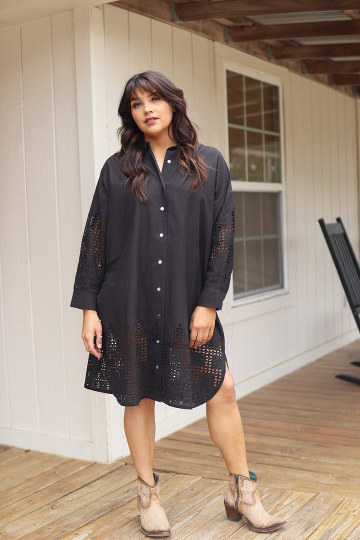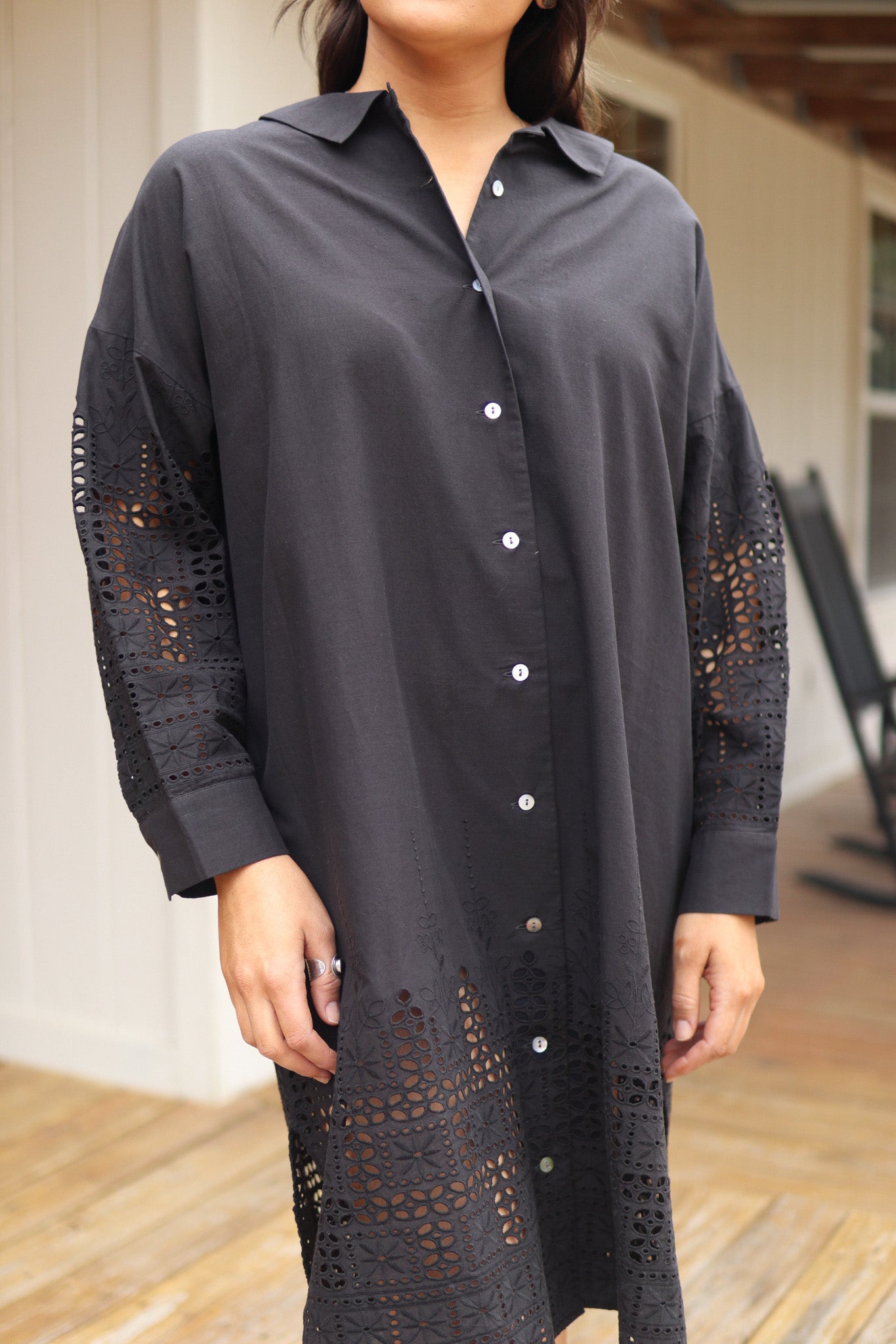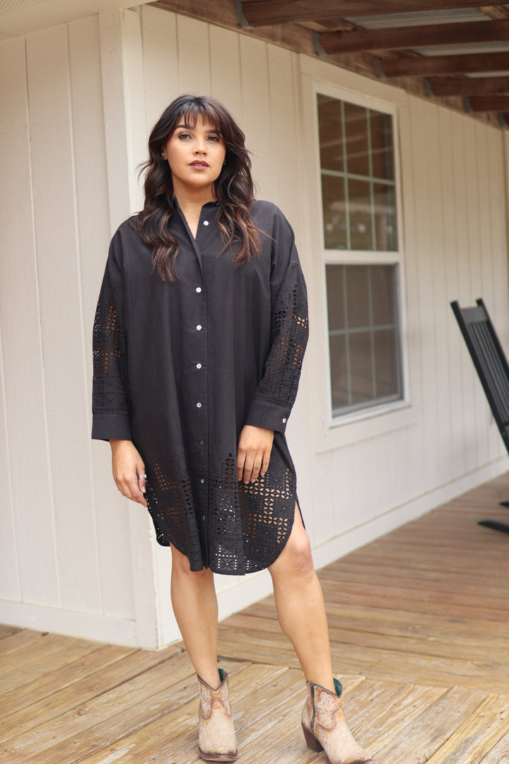 This black shirt dress is designed with a front button closure for a refined and functional look. Its clean lines and tailored fit make it ideal for versatile styling, suitable for both office environments and casual outings. The dress offers a sophisticated foundation for layering or wearing alone, ensuring a polished appearance with minimal effort.