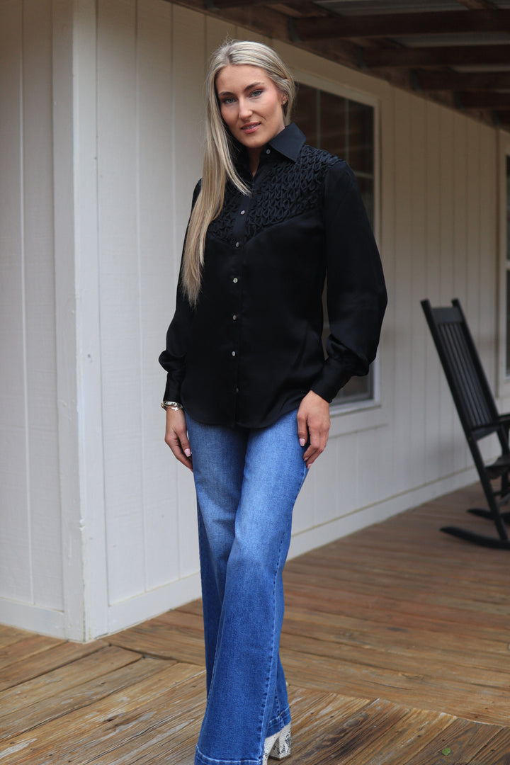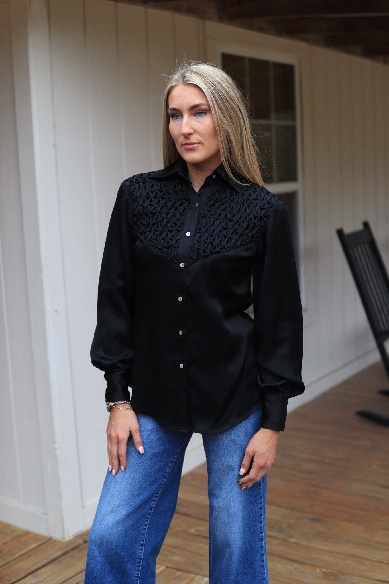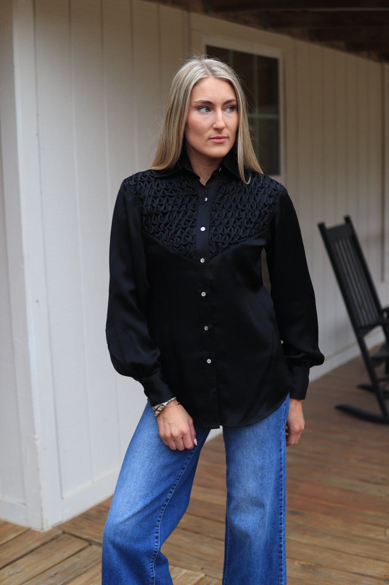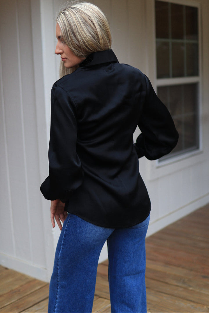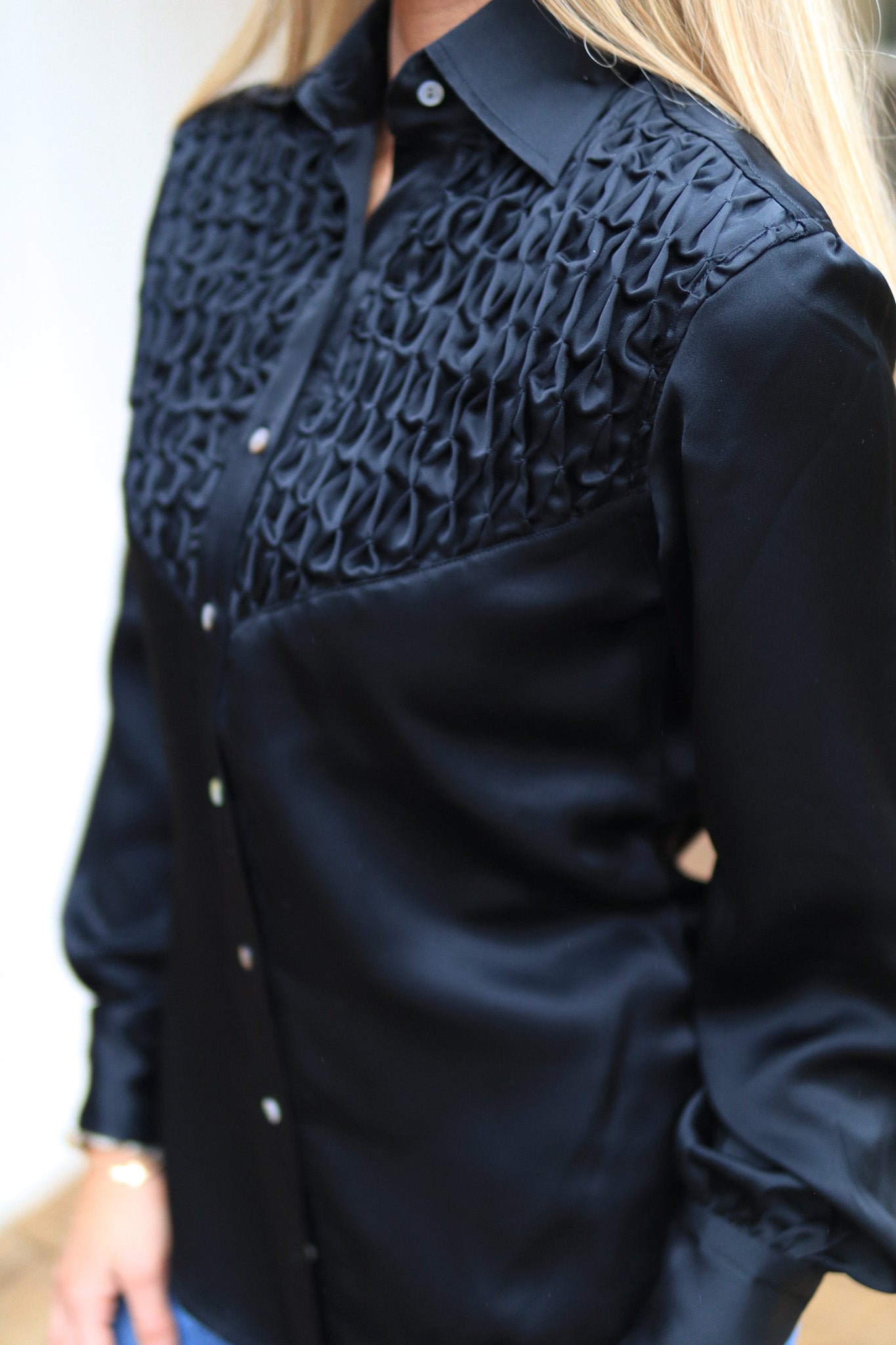 Sophisticated with a hint of intrigue, this black silky rayon top is anything but ordinary. The classic button-up, collared silhouette is elevated by elegant draping and subtle twists in the fabric, creating a beautifully unexpected detail that catches the light with every movement. Soft, fluid, and effortlessly chic, this piece brings a modern edge to timeless style. Whether paired with sleek trousers for a polished look or dressed down with denim for understated elegance, this top is a wardrobe essential for those who love refined fashion with a touch of the unexpected.