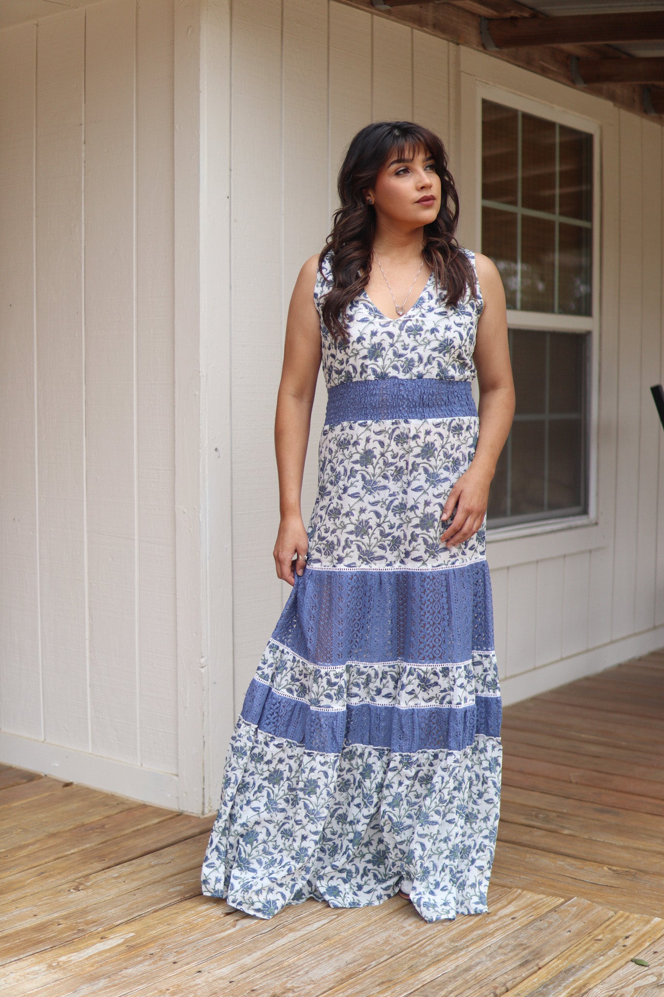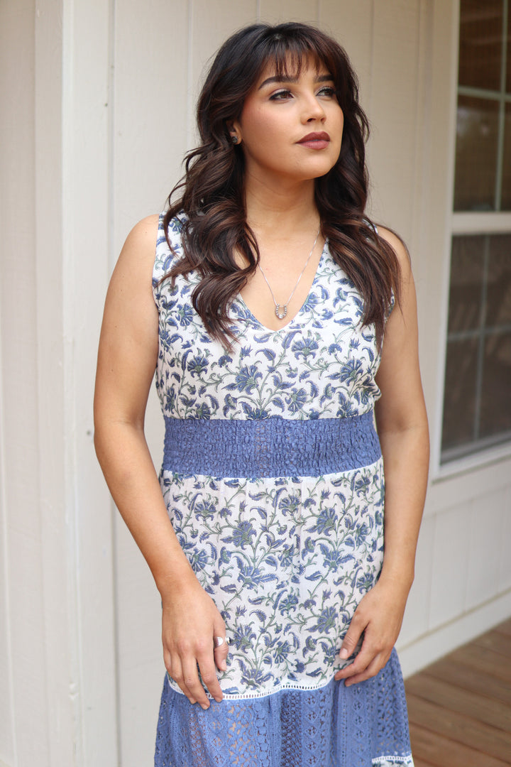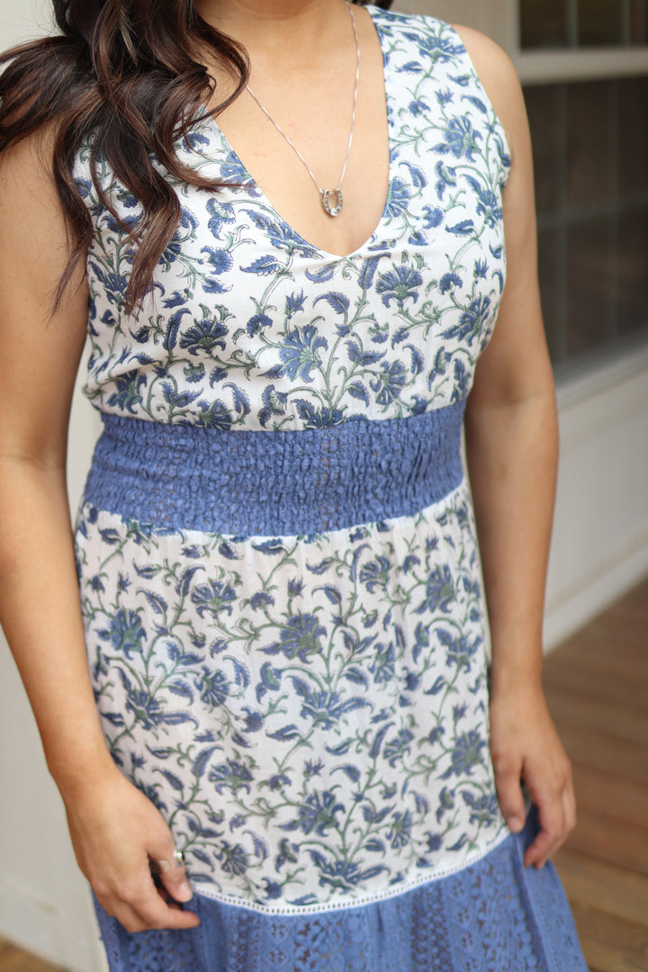 Embrace vintage charm with this blue and white floral cotton sundress, featuring delicate blue lace accents. The flattering V-neck design adds a touch of elegance, making it the perfect choice for your next garden party or beach stroll. With its timeless floral print and feminine lace details, this dress combines relaxed beauty with a hint of classic boho flair. Comfortable, stylish, and effortlessly chic, it’s a must-have for those sunny days and warm nights.