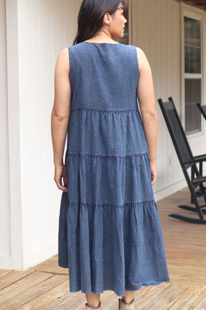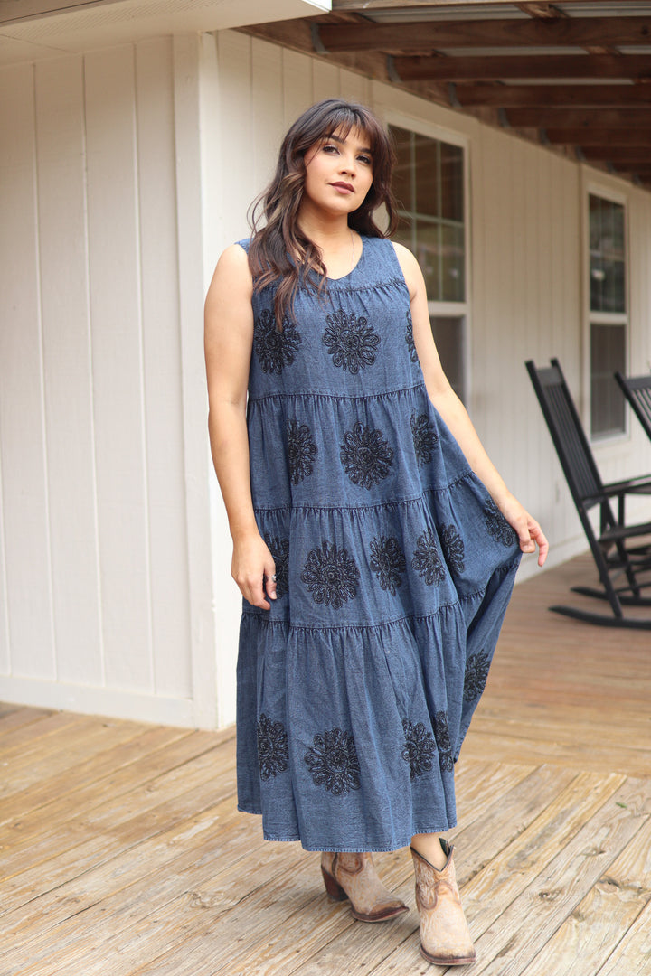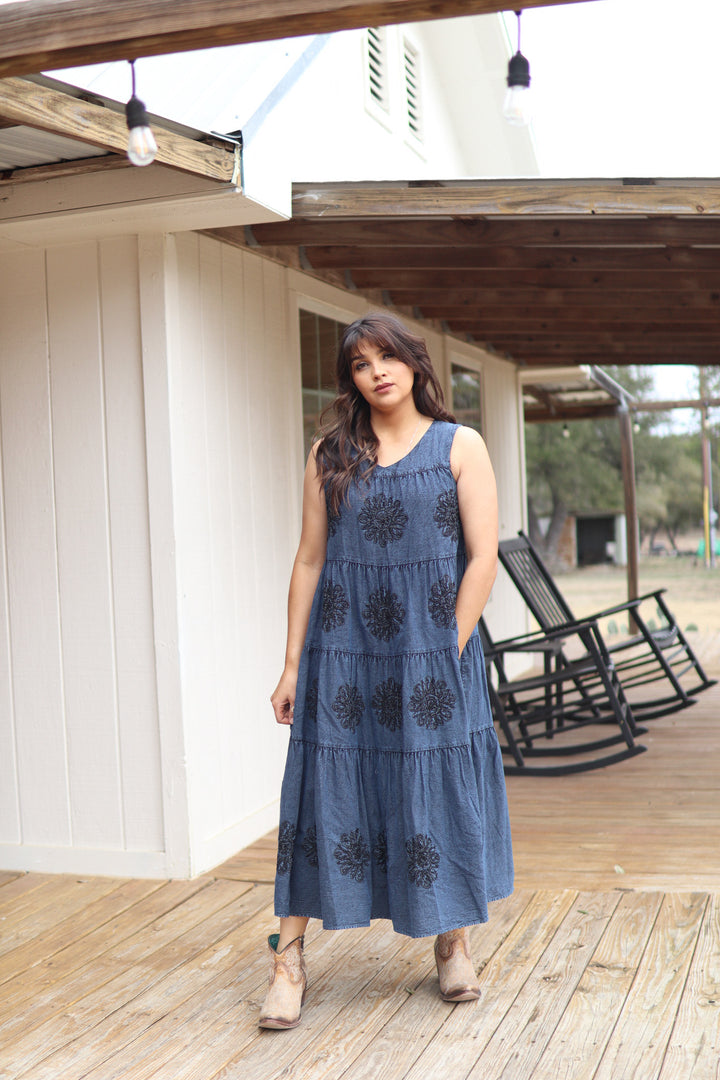 This denim sundress combines the timeless charm of lightweight washed denim with a repeating floral pattern, creating a unique and stunning look. Perfect for sipping coffee on your wraparound porch or dancing through a field of wildflowers, this one-of-a-kind dress captures the essence of effortless beauty and rustic elegance. Its soft, breathable fabric ensures comfort while its eye-catching design will make you feel special and radiant no matter the occasion. Embrace the beauty of nature and the joy of simple moments in this beautiful sundress.