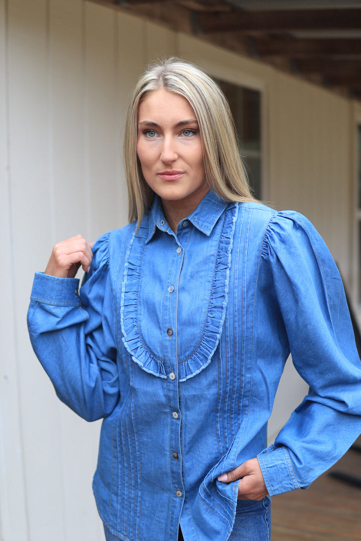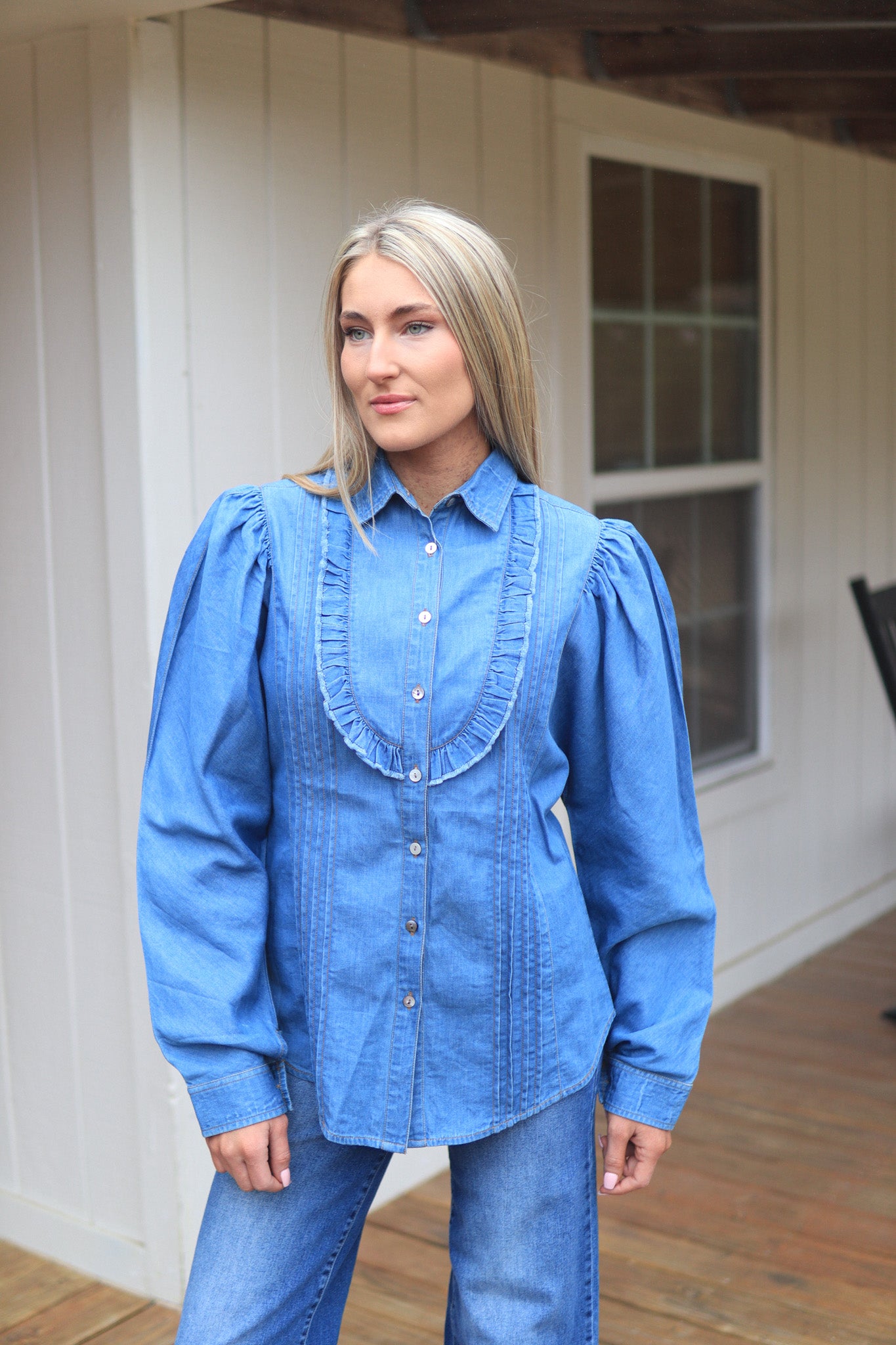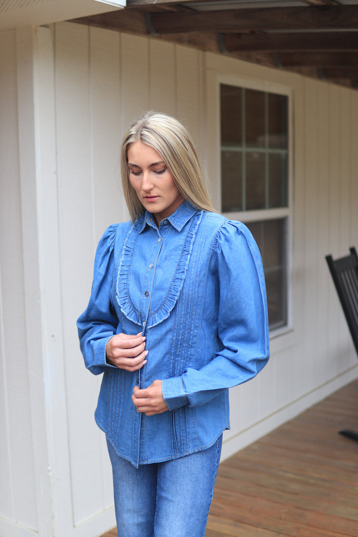 This soft denim blouse brings a touch of casual elegance with its romantic puff sleeves and delicate ruffled front yoke. The classic button-up design makes it effortlessly chic for the office, while its versatile style allows you to dress it up with a skirt or leather pants for a more sophisticated, fashion-forward look. Lightweight and stylish, this blouse is perfect for those who love timeless pieces with a modern, feminine twist.