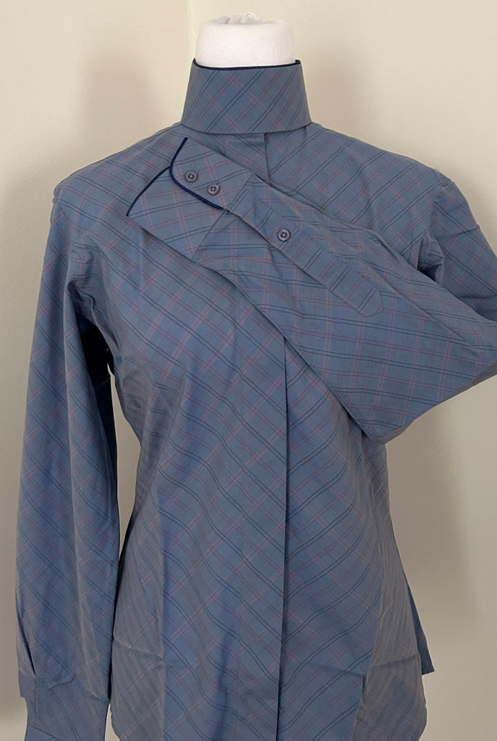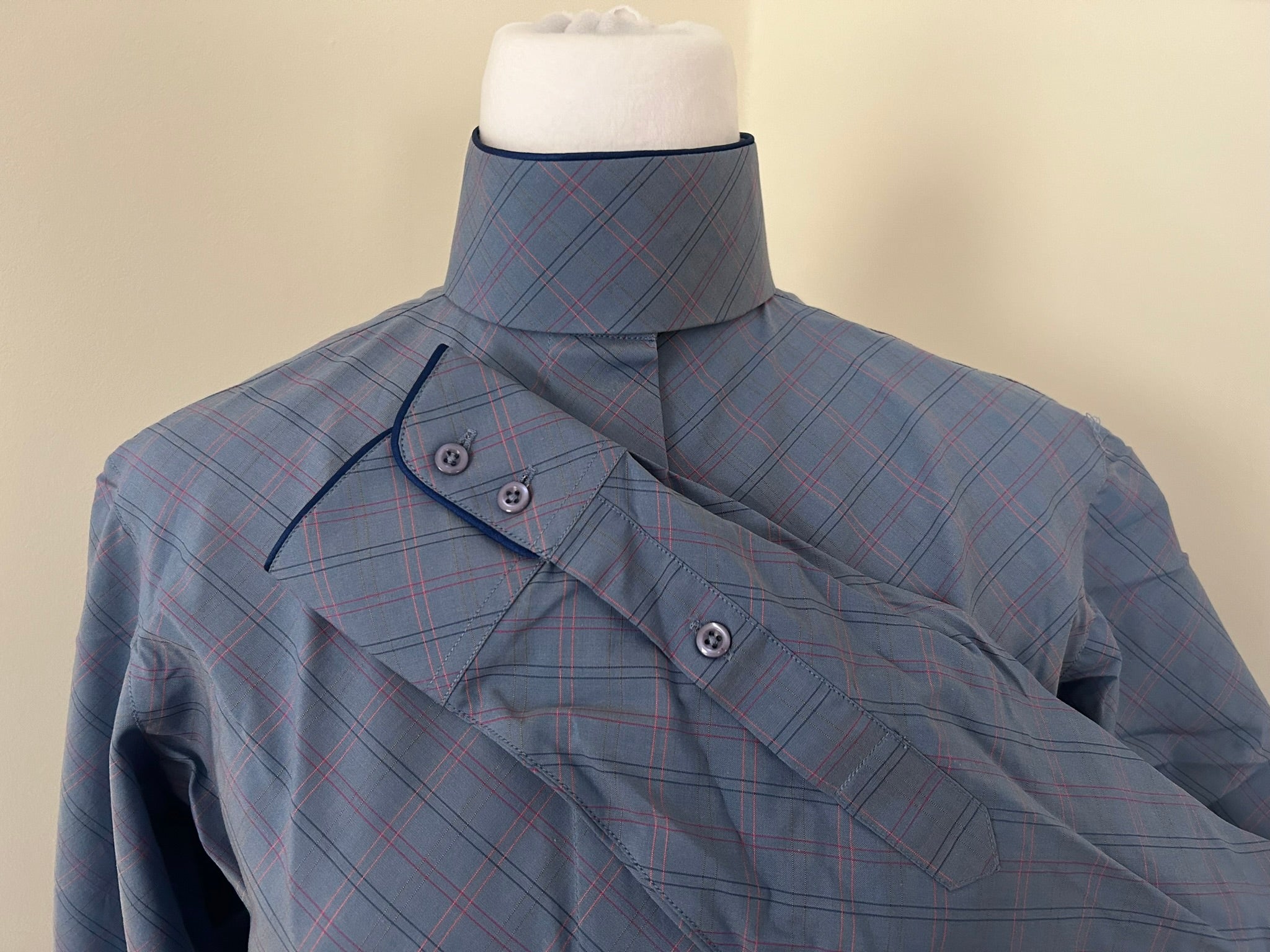 Features: Full front placket with hidden buttons, Beautifully woven blue-colored fabric, Breathable fabric