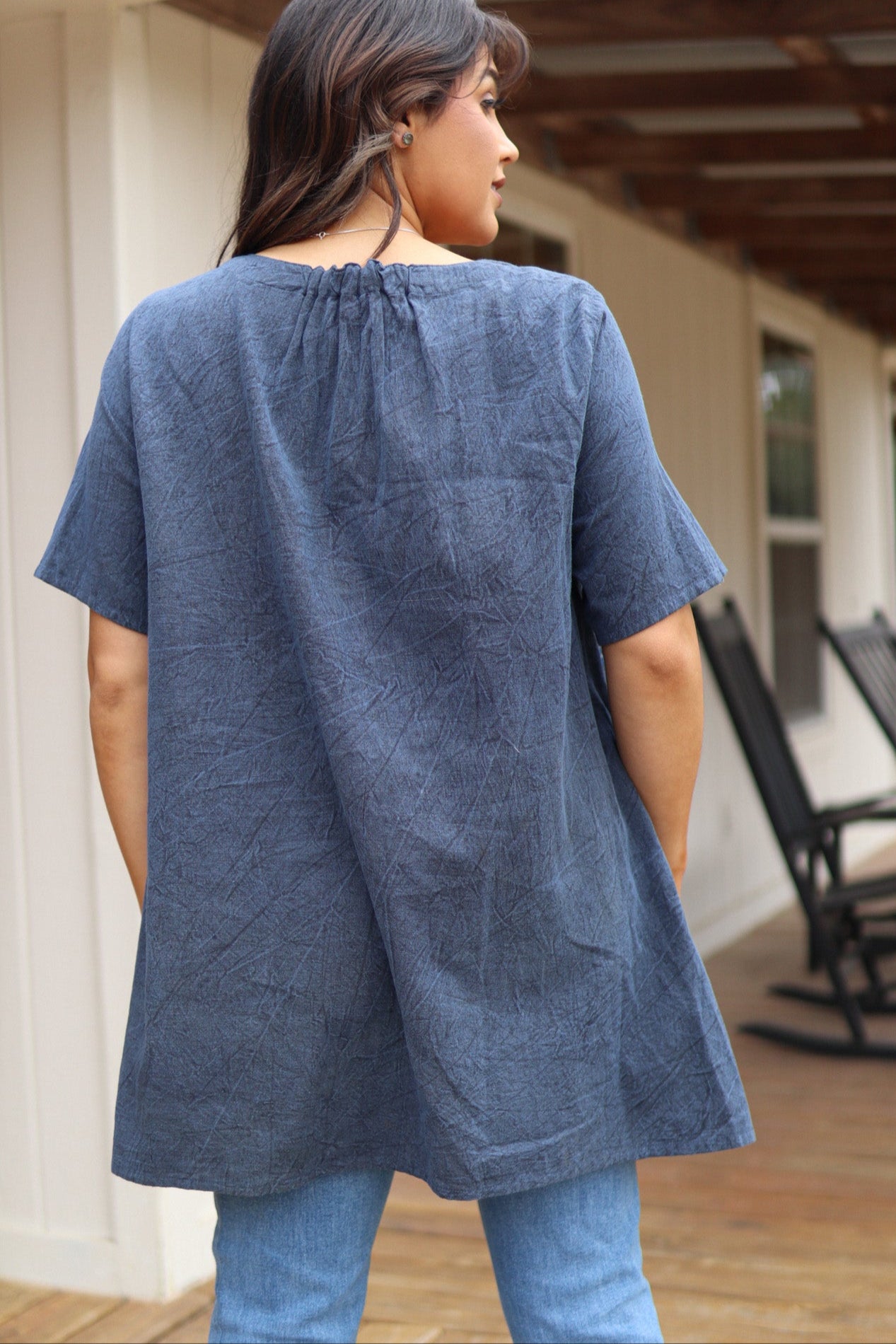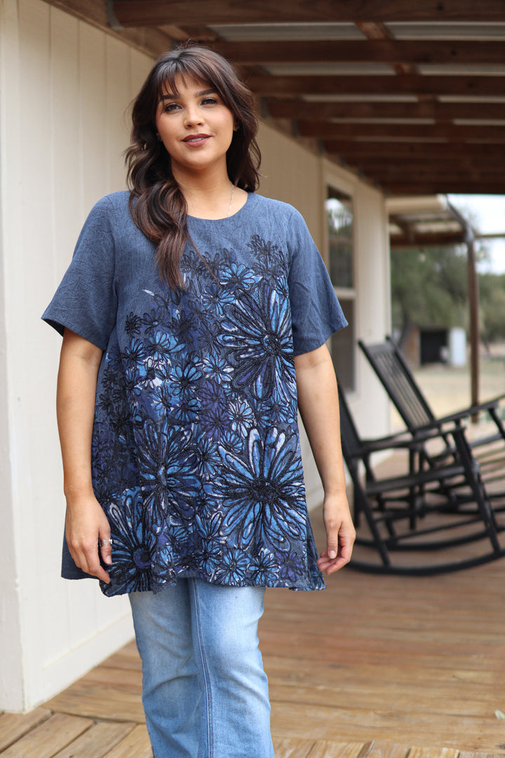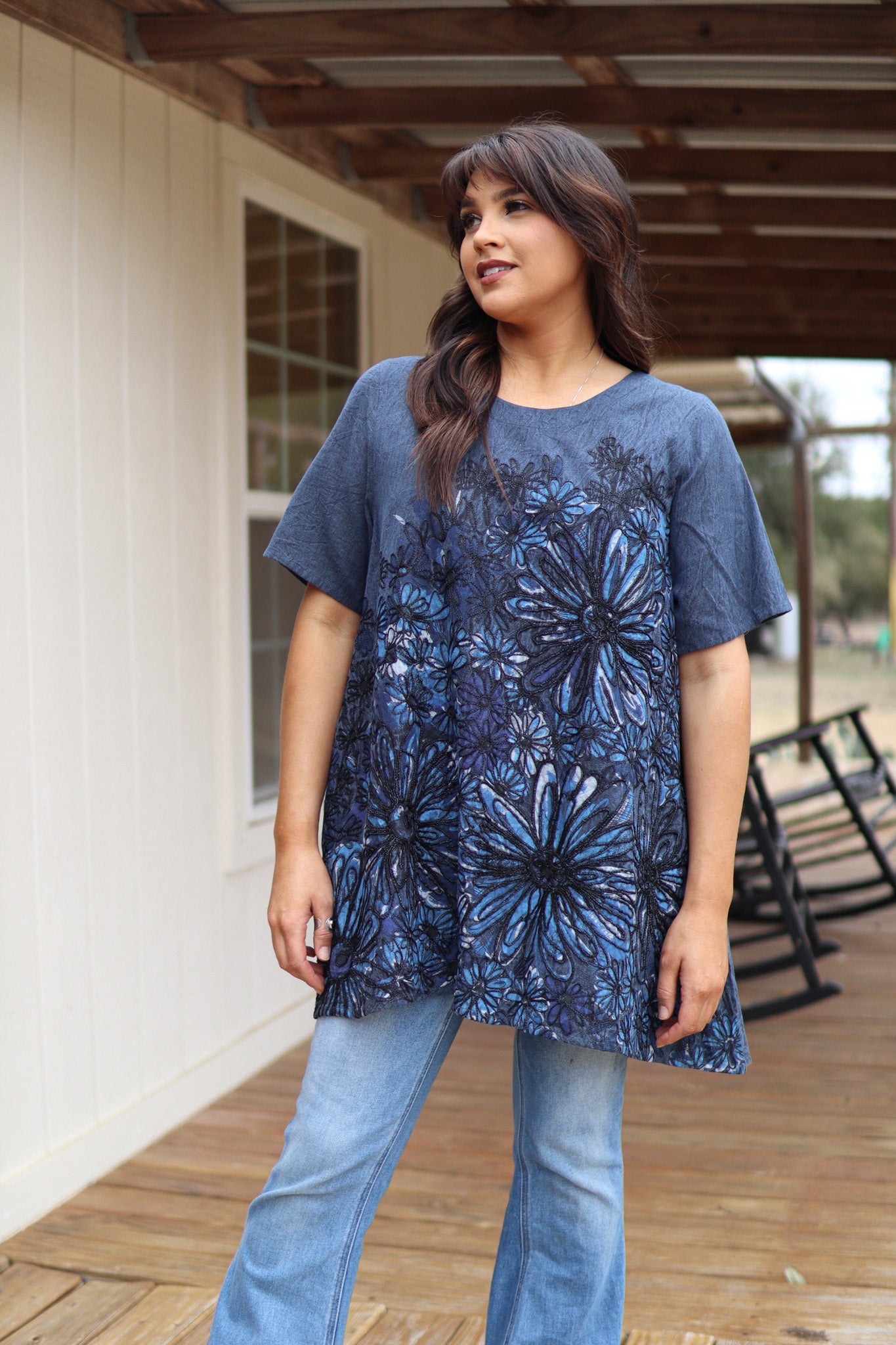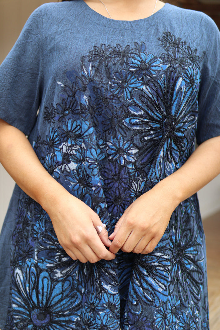 This navy blue blouse features exquisite floral embroidery that blends deep blue and black tones for a sophisticated, textured appearance. Expertly crafted, it offers a refined silhouette with intricate detailing that enhances both formal and casual outfits. The combination of rich colors and delicate stitching makes this blouse a versatile and elegant addition to any wardrobe, perfect for those who appreciate meticulous design and timeless style.