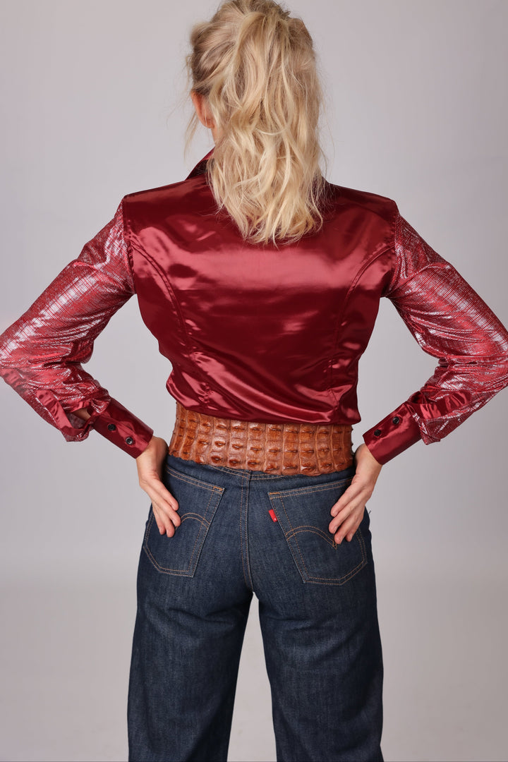 A sister to the full cherry red and metallic blouse, this western performance shirt offers a different take on the same riff. Sporting the same buttons and durable fit that cowgirls crave; this blouse is perfect for your next barrel race, horse show, or dinner with the girls. A truly versatile piece of western rodeo fashion, our silky satin fabric ensures there is no shortage of places an equestrian wouldn’t wear this piece!