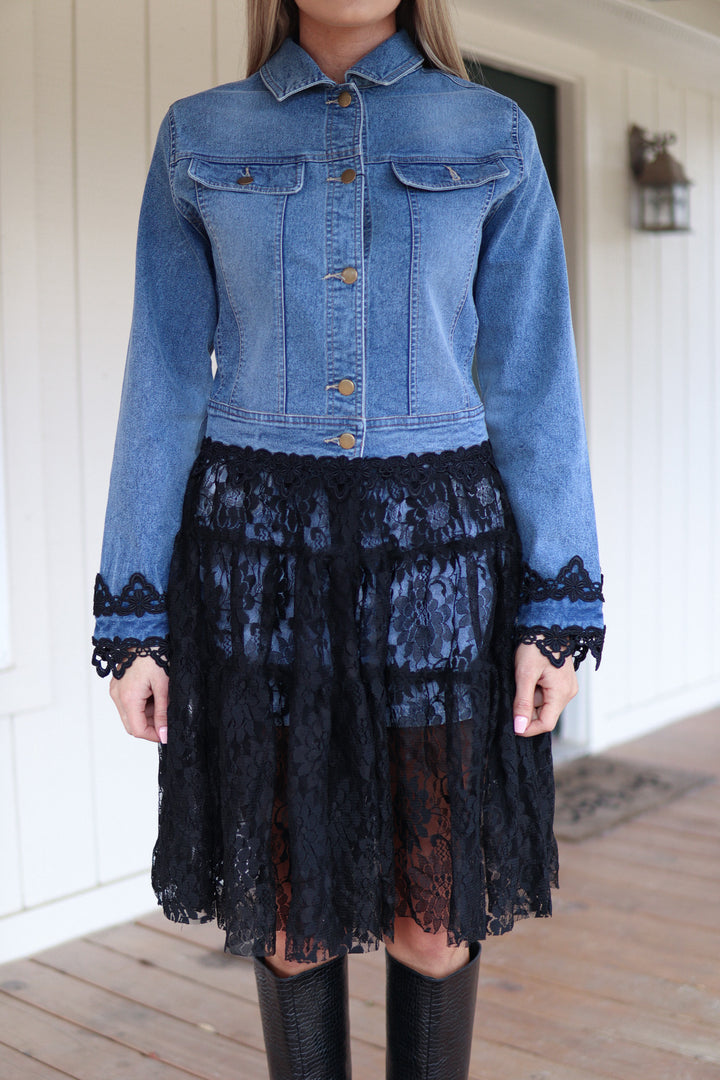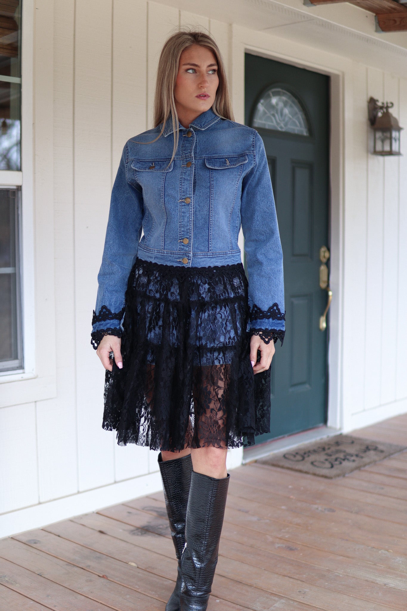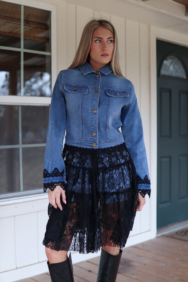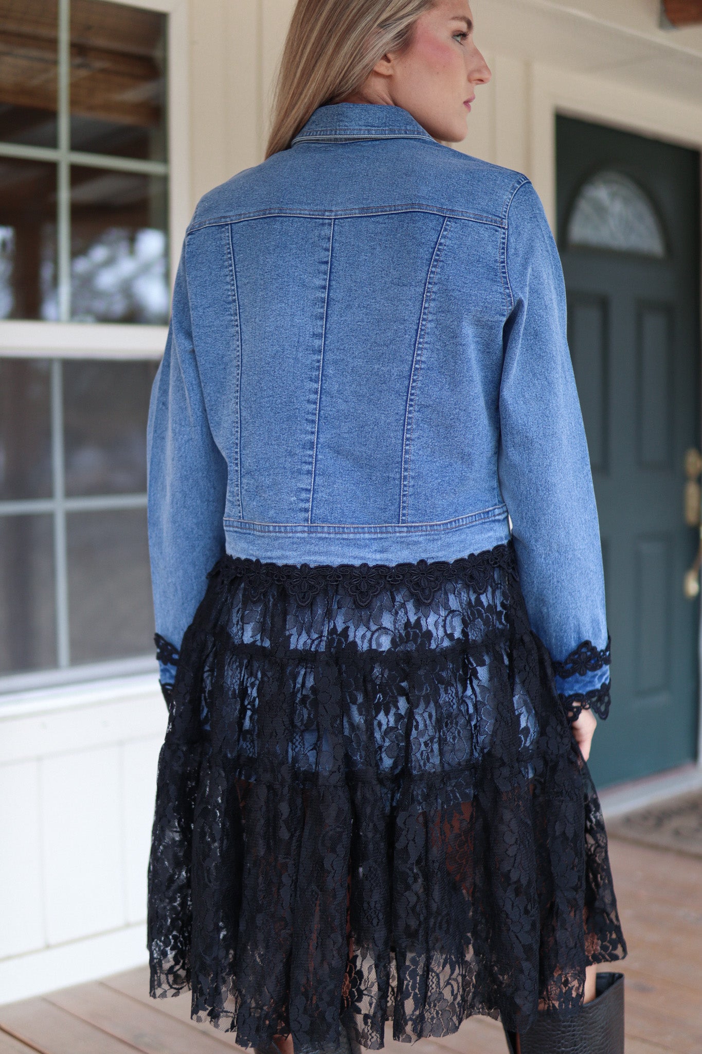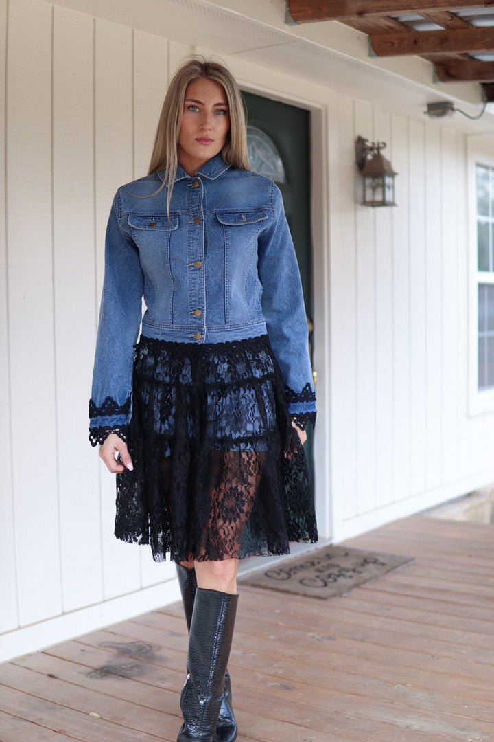 This light wash denim jacket is elevated with a Boho-inspired black lace knee-length trim, adding a unique, feminine touch. Matching black lace accents adorn the cuffs, creating a perfect balance of soft and edgy style. Pair it with a floaty Boho dress for a laid-back look or make it more edgy with leather leggings. Comfortable and stretchy, this jacket is the ideal versatile piece to add to your wardrobe, offering both style and comfort for any occasion.