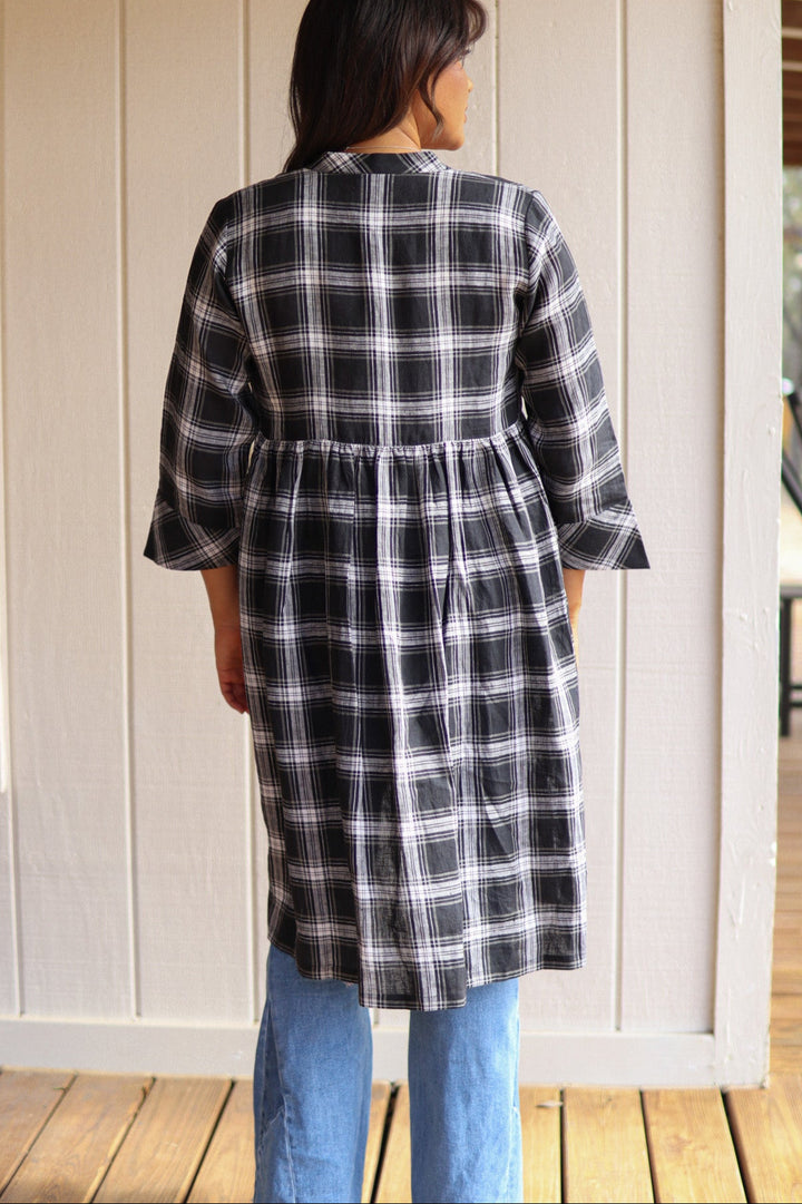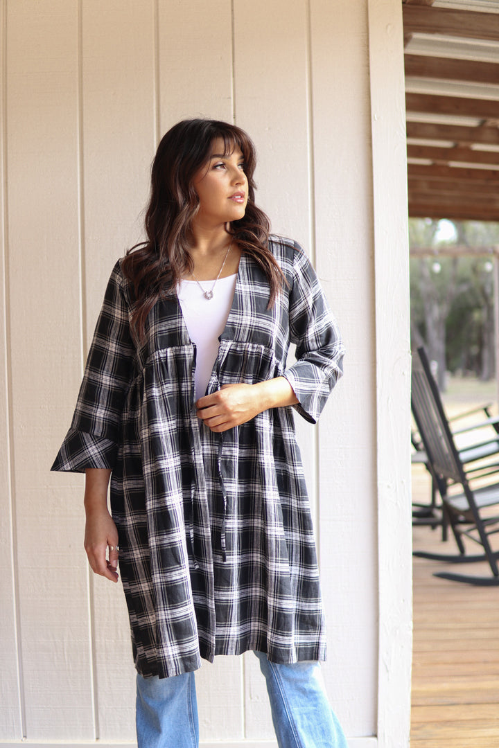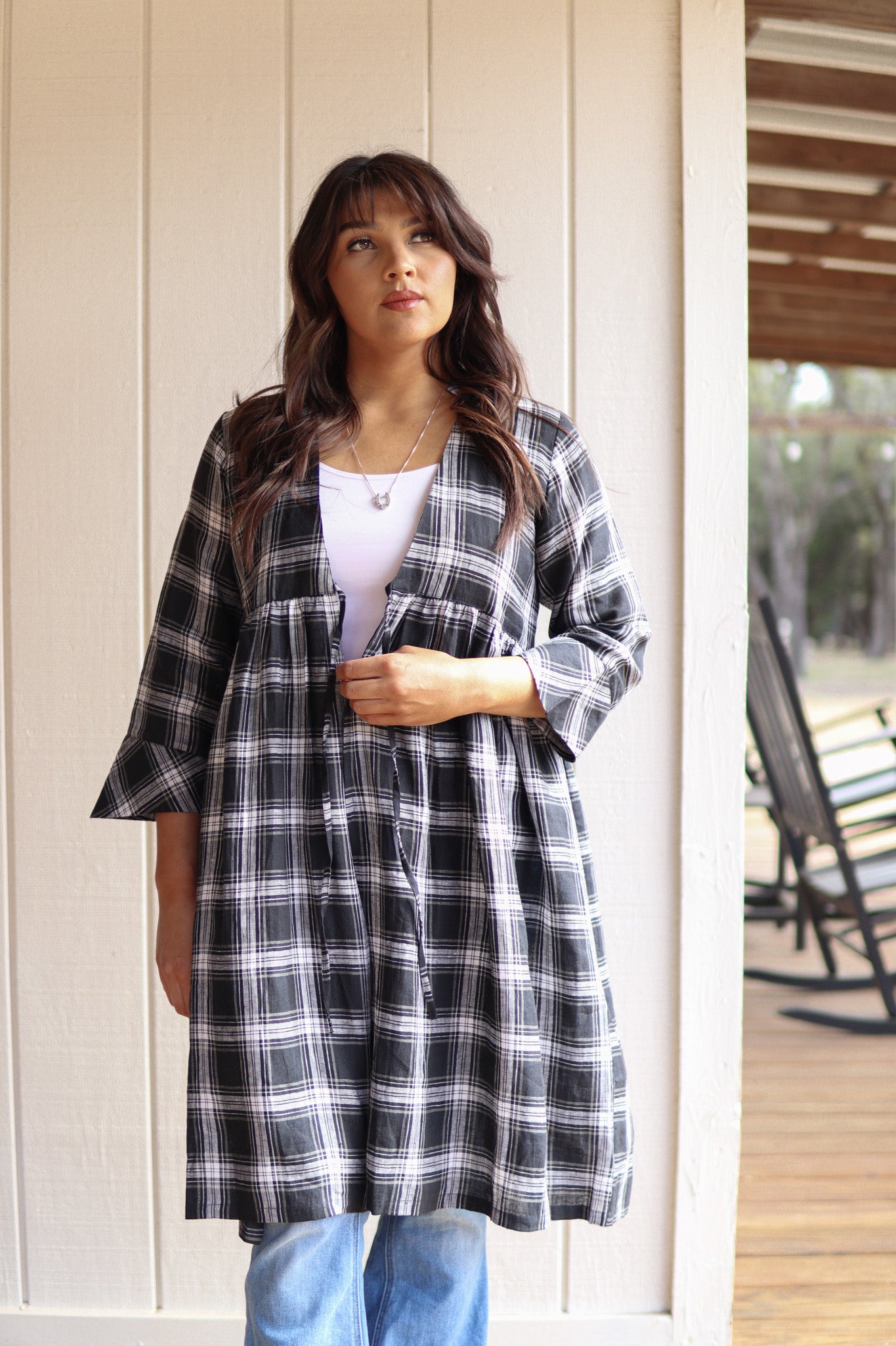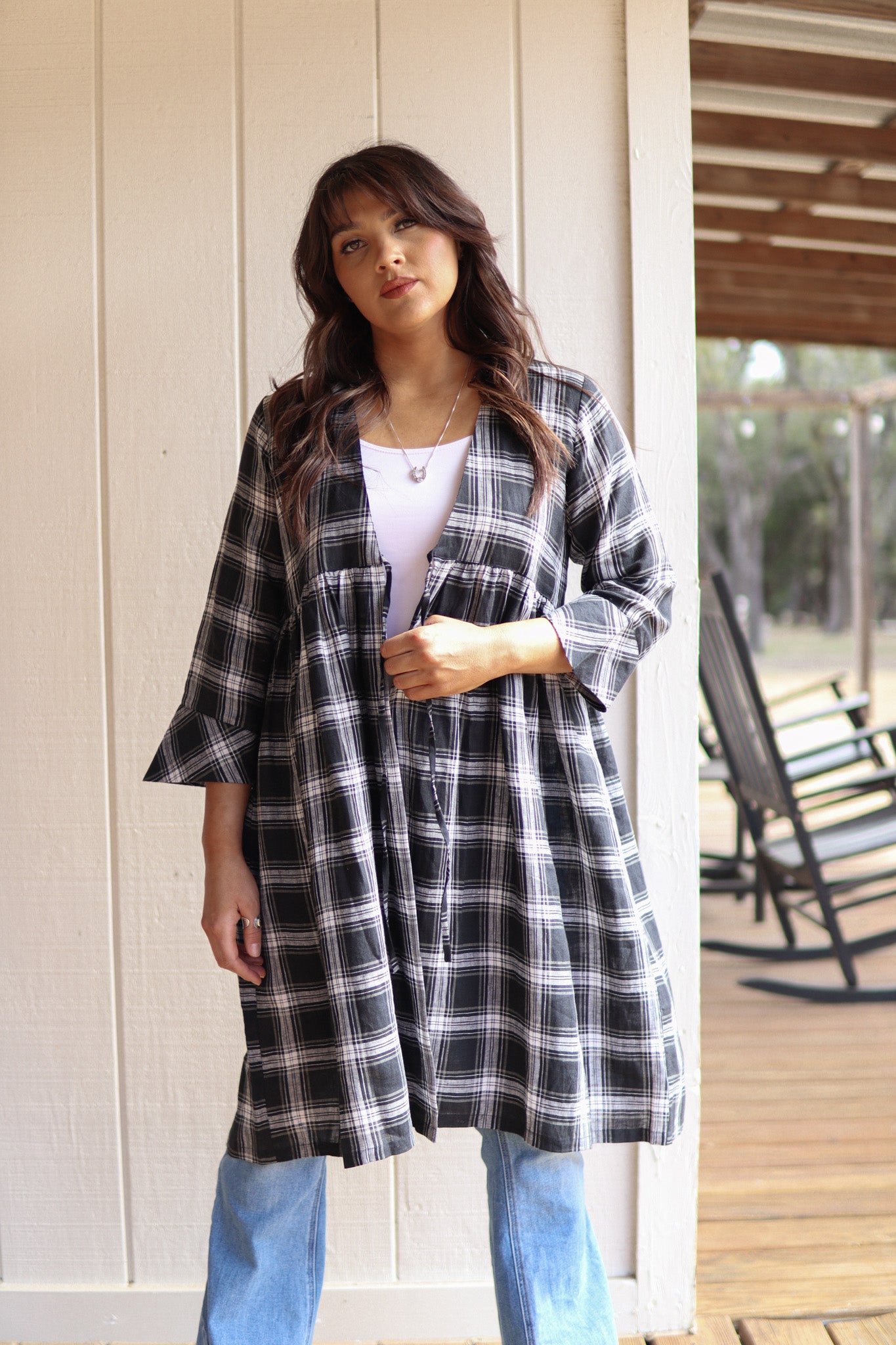 Effortless and versatile, this black and white plaid duster is the perfect layering piece for any occasion. Featuring elbow-length sleeves and a front tie, its lightweight, breathable cotton fabric makes it easy to style year-round. Pair it with your favorite jeans and a white tee for a casual yet polished look, or layer it over a flowy dress for a chic brunch ensemble. Whether dressed up or down, this duster adds a touch of effortless elegance to your wardrobe.