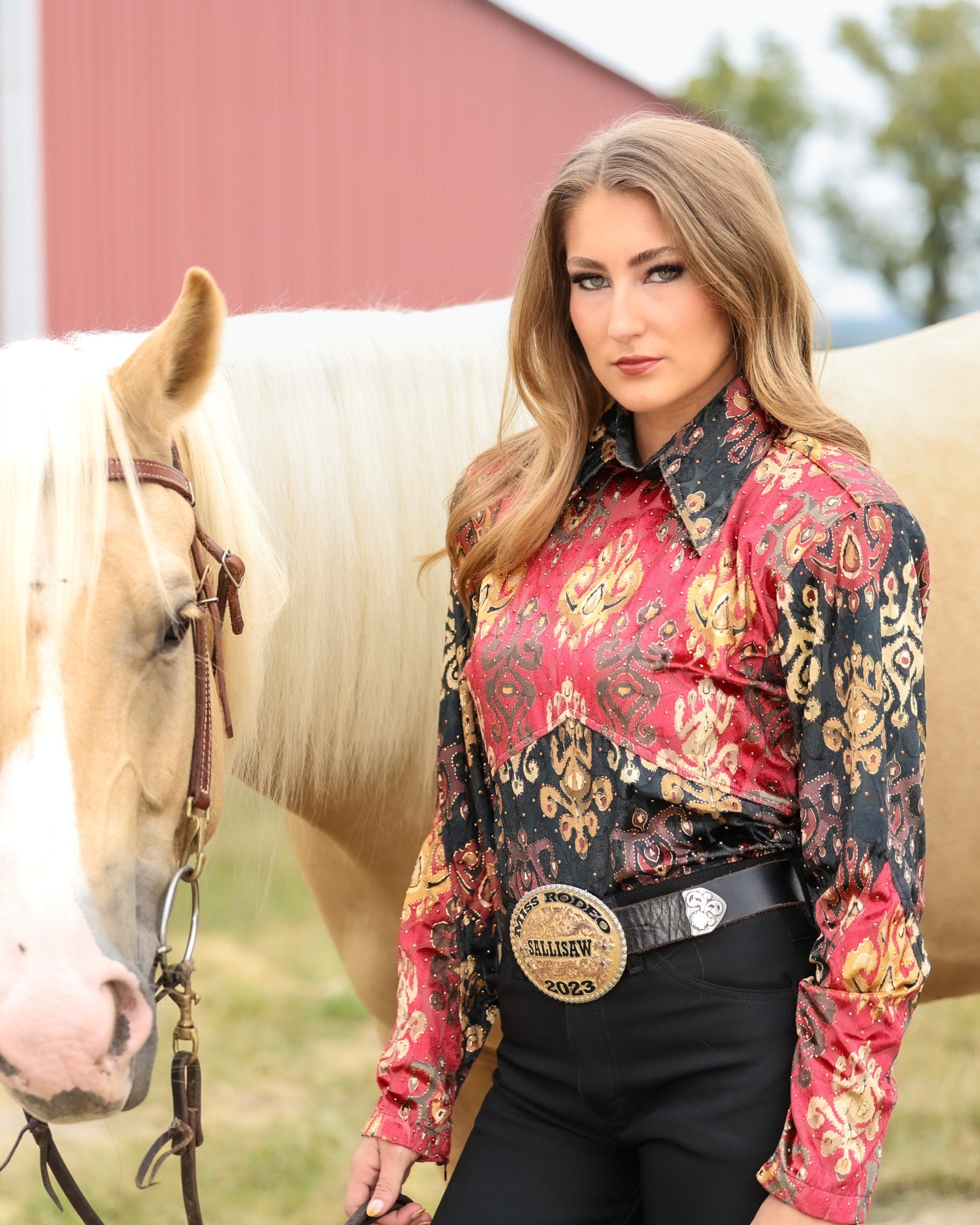 Look no further for your next Showmanship Performance Arena Shirt, a striking blend of elegant fashion and show-ring sophistication. This stunning performance blouse features an eye-catching design with bold patterns of deep red, black, and gold, perfect for making a statement in the arena.Crafted from a luxurious velvety stretch fabric, it ensures both comfort and flexibility for peak performance. The shirt's rhinestone accents add a touch of sparkle under the arena lights, while the sleek back zip provides a tailored fit for a polished look. Complete with a classic collar, this collared shirt is designed for riders who demand both style and function. Whether you're competing in the ring or showcasing your style, this showmanship performance shirt delivers.