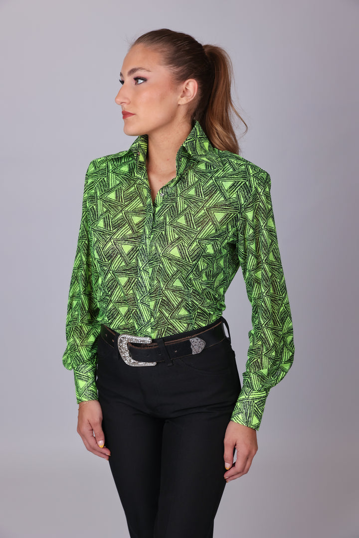 Bright and bold! This arena shirt is crafted from breathable, lightweight fabric, perfect for all-day wear, whether you're in the arena or out on the town. The bold geometric lime green and black pattern adds a touch of flair, while the sleek, hidden zipper and velcro cuffs ensures a clean, polished look. Ideal for active lifestyles, barrel racers, and flag girls, this versatile arena blouse offers the performance quality you need with the all-day comfort you deserve. Elevate your wardrobe with this stylish, versatile shirt made for arena wear and beyond.