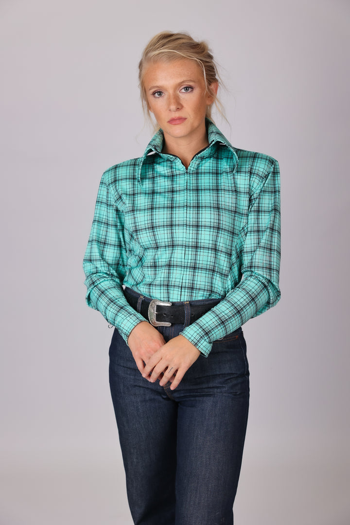 Ready for an everyday essential to add to your rodeo wardrobe? Look no further than this plaid turquoise collared riding shirt, the perfect color and breathable design for busy rodeo athletes. Super soft material, classic front zipper, and adjustable Cuff closures makes this performance shirt an easy go-to grab for any on the go cowgirl!