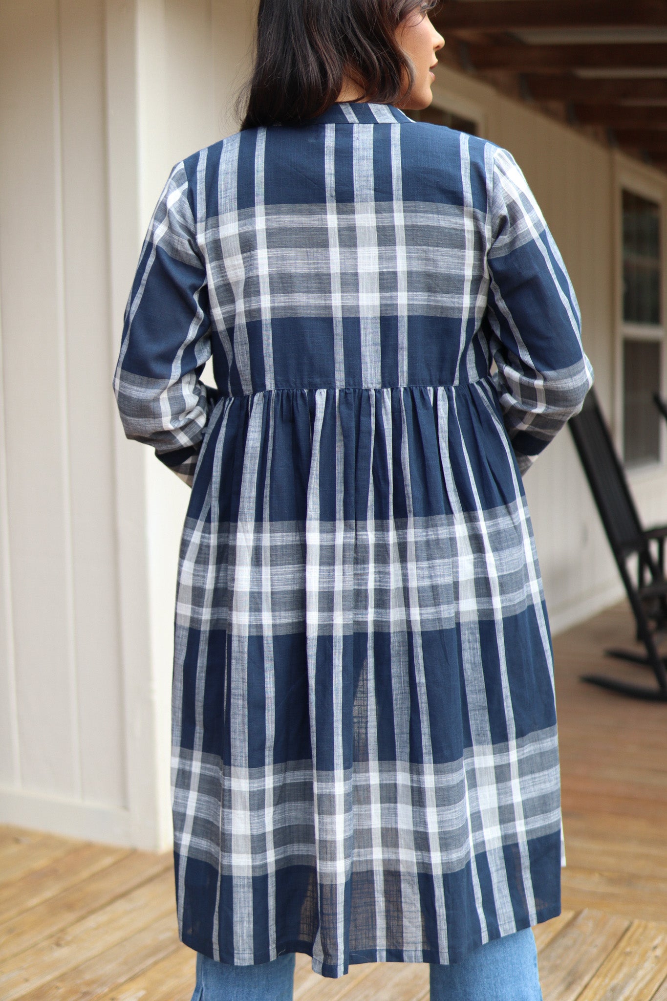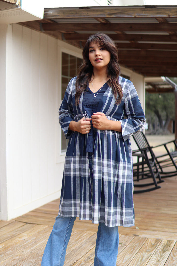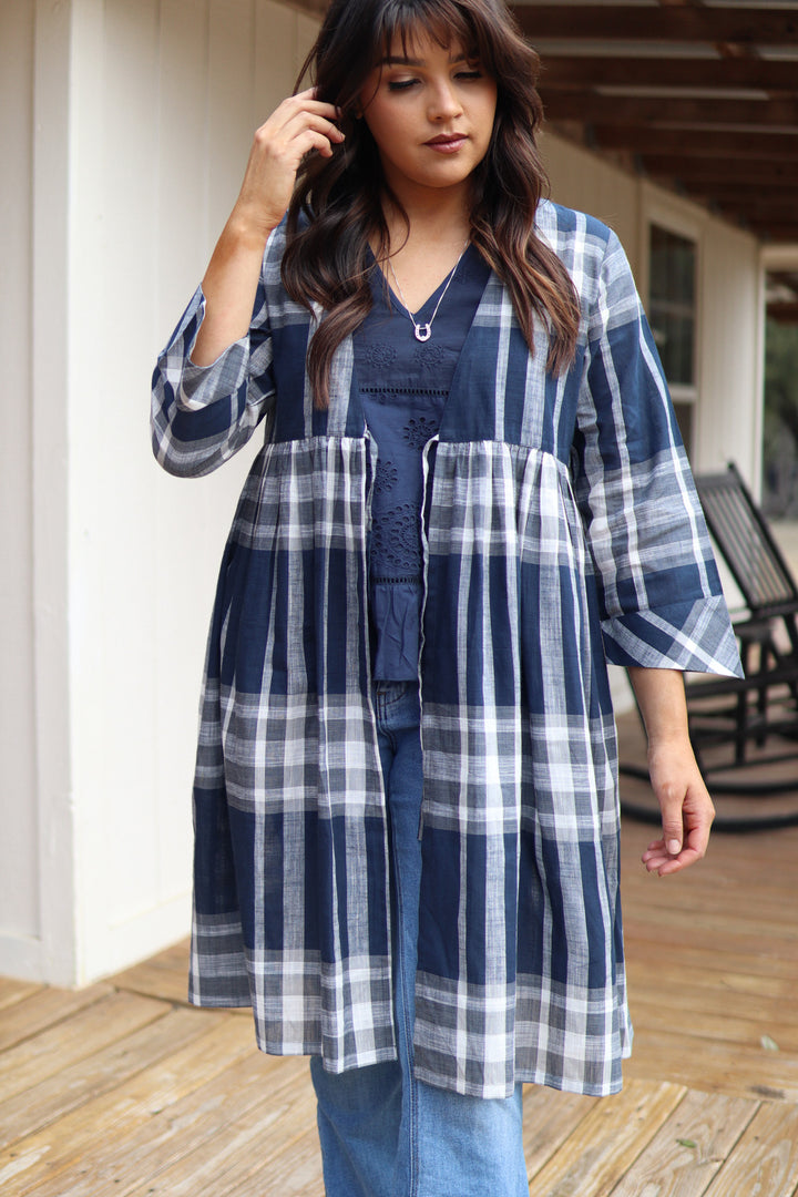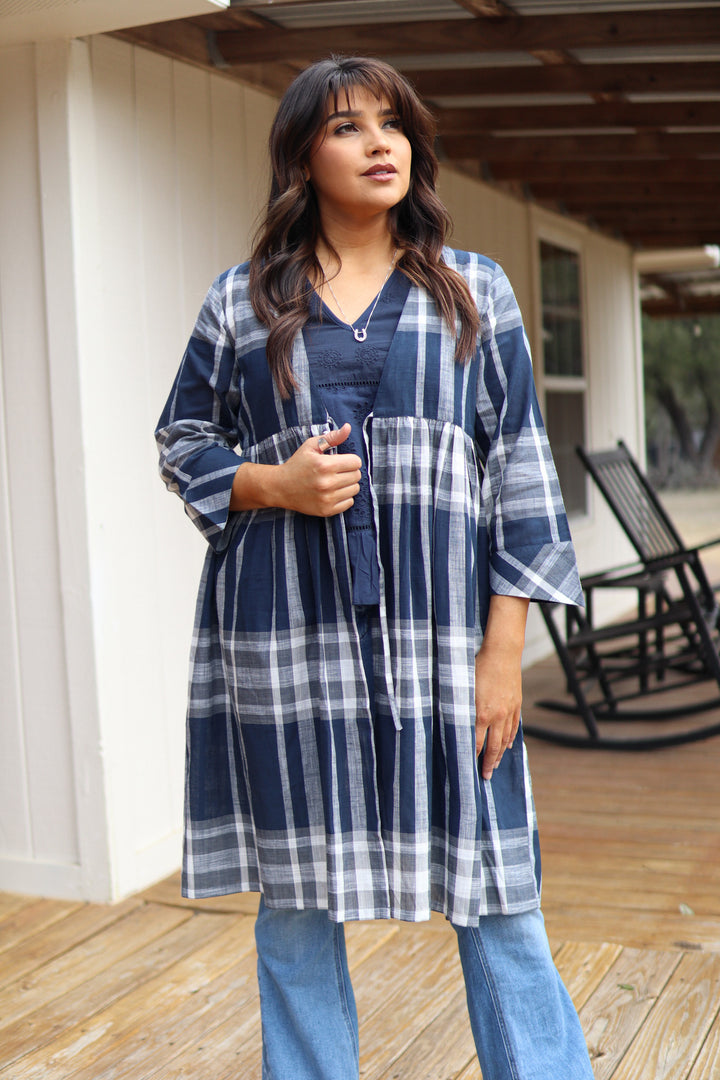 Light, airy, and effortlessly stylish, this blue and white plaid duster is a must-have layering piece. Designed with elbow-length sleeves and a front tie, it offers the perfect balance of comfort and sophistication. Wear it over a classic jeans-and-tee combo for a relaxed yet polished look, or pair it with a flowy dress for a chic brunch or seaside stroll. Breathable and versatile 100% cotton, this duster will quickly become a go-to favorite for every season.