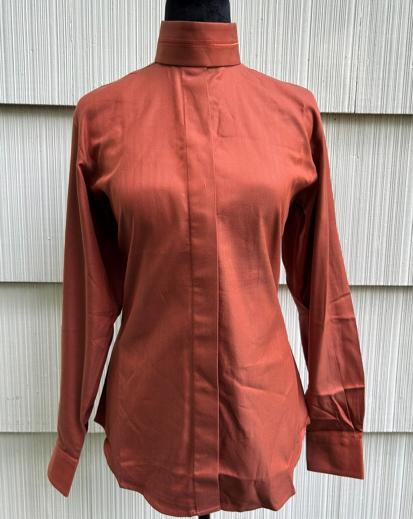 Features: Full front placket with hidden buttons, Beautifully woven terracotta-colored fabric, Breathable fabric