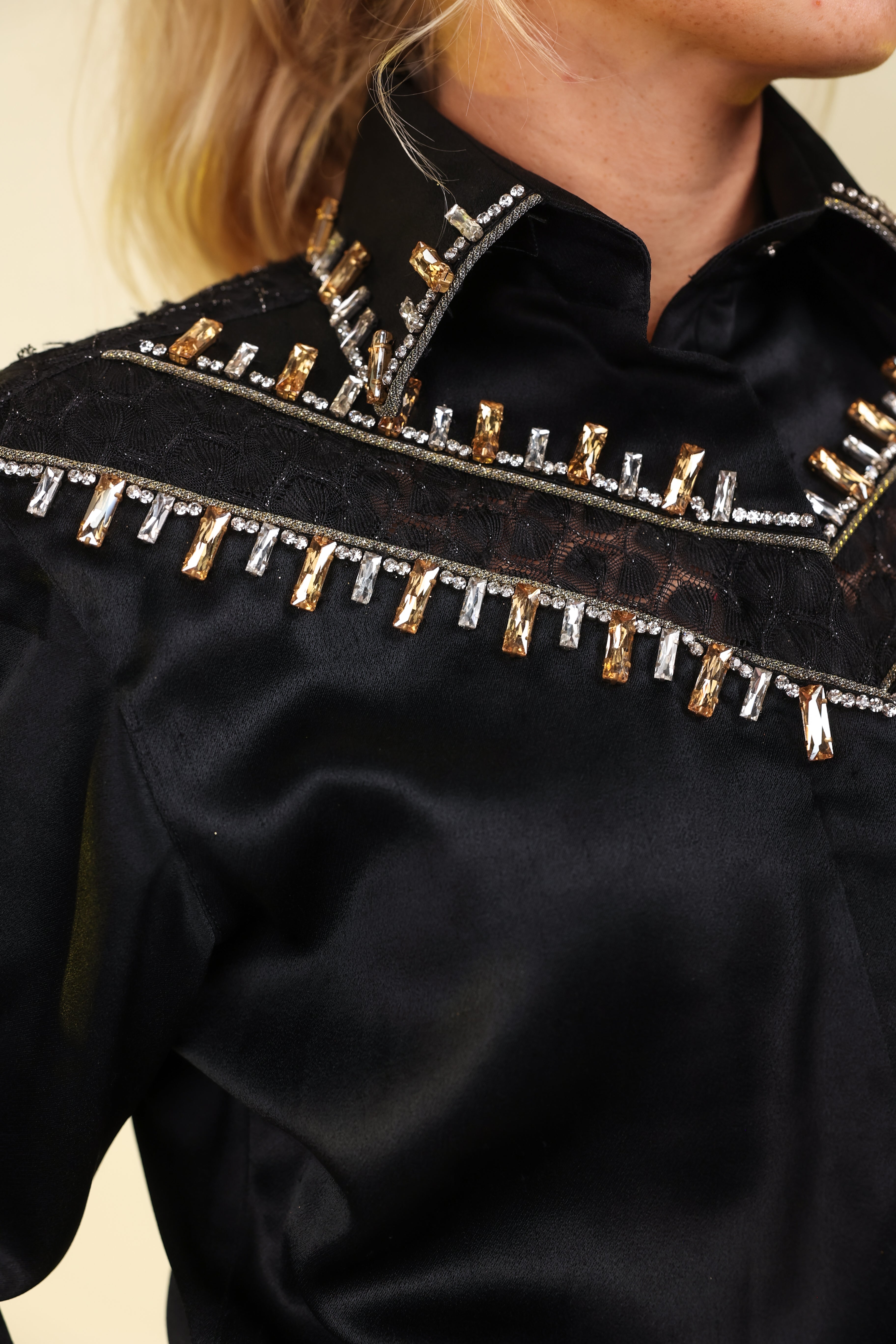 Radiating elegance, our black satin arena shirt is a true masterpiece for the urban cowgirl. Adorned with stunning geometric crystals that beautifully blend the purity of white with the opulence of gold; this shirt transforms modern elegance into a fashion statement. The rhinestone details on the collar and cuffs add a sparkling touch that will shine under arena lights, while the subtle lace detailing between the layers of radiating crystals introduces a hint of romance. Designed for versatility, this western show blouse features a hidden front zipper and Velcro cuffs, perfect for pairing with black jeans or your favorite skirt after a successful ride around the show ring.