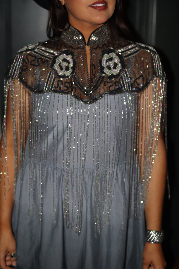 Shine bright in this stunning navy sequin cape featuring silver glass bead accents and a delicate floral design. The shimmering sequins and hand-beaded mandarin collar create an eye-catching effect, while the hip-length fringe sways with every step. Perfect for rodeo concerts, NFR watch parties, or western galas, this cape adds drama and elegance to any look. Pair it with leather pants and boots for a head-turning ensemble. Handcrafted to sparkle, it’s the ultimate statement piece for the bold cowgirl.