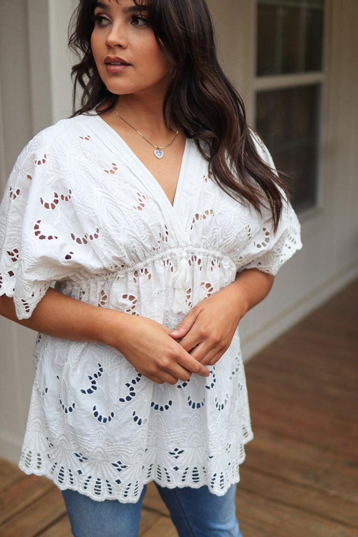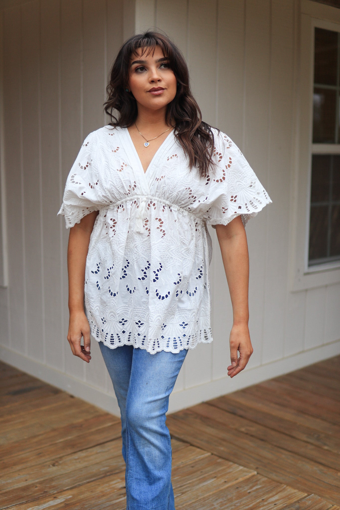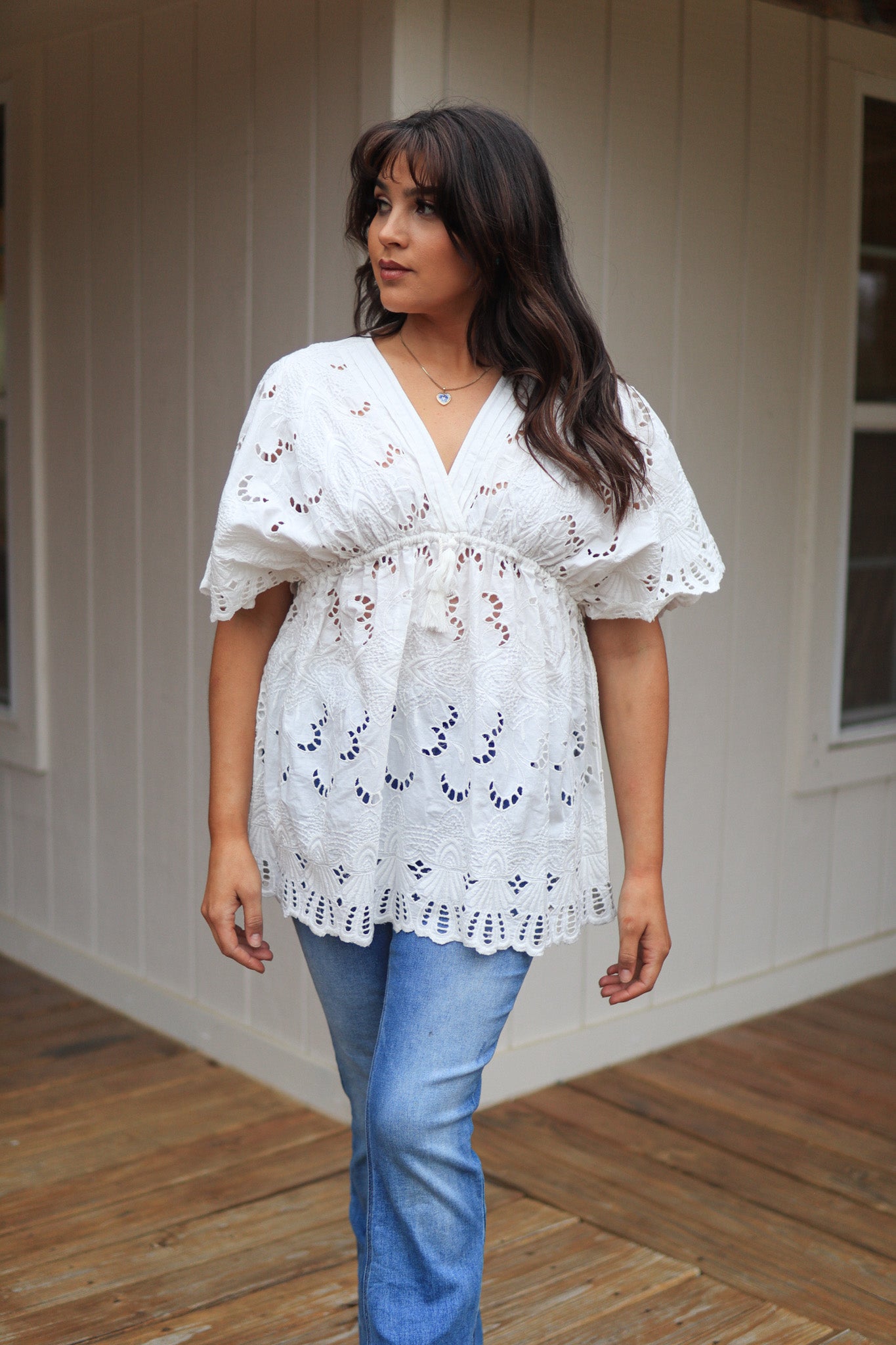 Embrace your inner romantic with this white lacy peasant tunic blouse, featuring a flattering deep V-neck and a ruched waist that beautifully defines your figure. The delicate lace detailing exudes timeless femininity, creating a romantic, ethereal vibe. Ideal for the lady enjoying her daily leisure, it offers both comfort and elegance, making you feel effortlessly chic whether you're enjoying a relaxed afternoon by the pool or a scenic stroll through the city gardens.